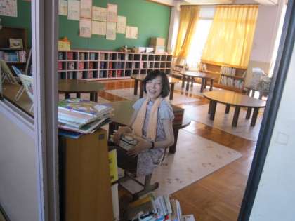 夏休みの今日も、図書館運営支援員の方が来られ、図書室やわくわくルームの図書の整備をしていただいています。