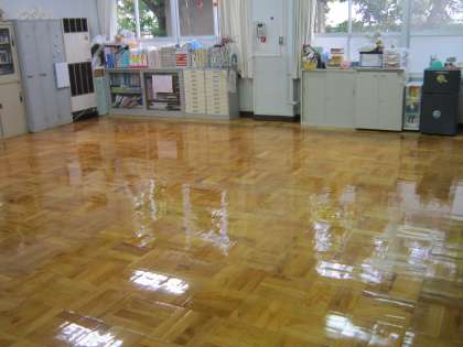 家庭科室に引き続き、今日は校長室と保健室の床にワックスがけをしてもらいました。まだ乾いていないのでモノ入れることができません。匂いも、ワックスの匂いですから、あまりいい匂いではありません。でも、ご覧の通りピッカピカになりました。