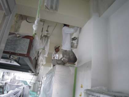高いところで、角のほうの作業も大変です。覆ってあるので、空気の換気も悪く、塗料のにおいもきつく、大変なお仕事です。でも、給食室が明るくなってきました。ありがとうございます。