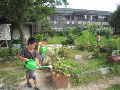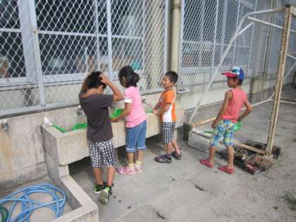 セミを見つけたり、バッタを見つけたりと水やり以外にも、ビオトープの自然をいっぱい感じている子どもたちです。