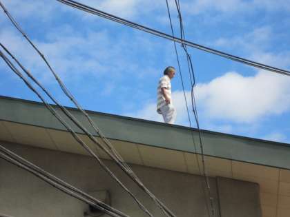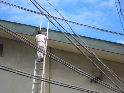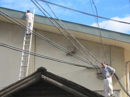 雨が降るたびに、そして、雨がやんでもしばらくの間、体育館の前がびしょぬれになり、ずっと気になっていました。初めは渡り廊下の屋根が壊れているのか?とも思ったのでっすが、業者の方に見てもらい、体育館の屋根の樋がつまっているとのことがわかりました。その作業を、朝から業者の方にしていただきました。