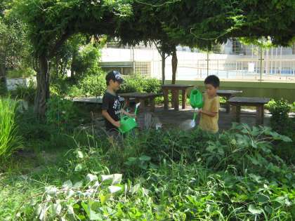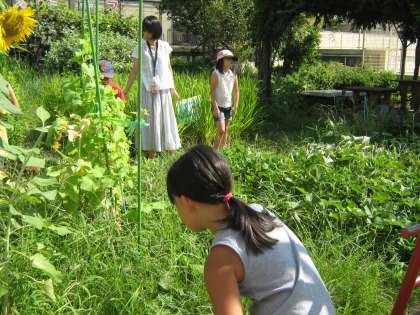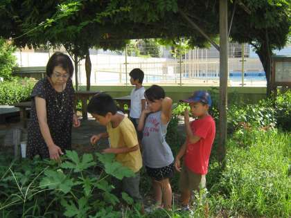今日も暑い日差しが降り注いでいます。夏休みもあと2日。2年生は,最後までしっかりと水やりの当番をしてくれています。今日は,オクラの薄黄色の花が咲いていました。プチトマトやオクラの実もできています。