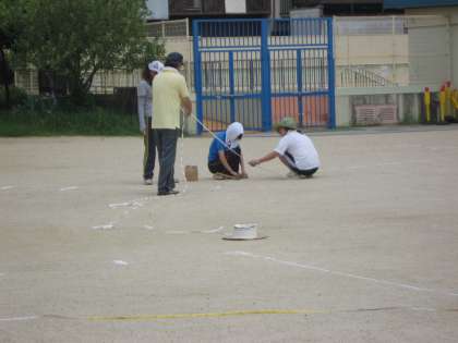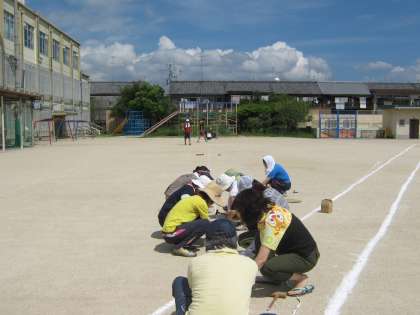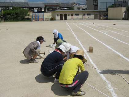 教職員で,運動場整備の作業をしました。日焼け予防の準備も整えて,がんばりました。運動会とその練習がきちんとできるように,ラインテープをきれいに貼りました。テープを20cmおきにスクリュー釘で打って行きました。
