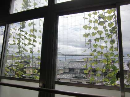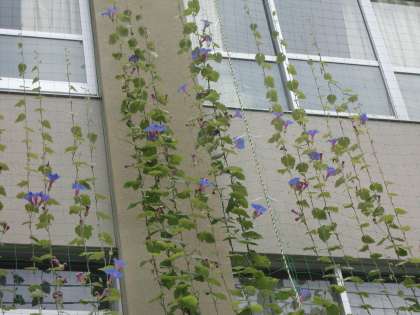 本校では今年初めて『緑のカーテン』に取り組みました。琉球アサガオの苗を植え付ける時期がやや遅かったので,「ちゃんと育つかどうか…?」気になっていました。