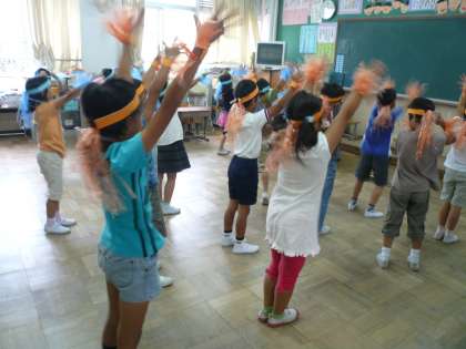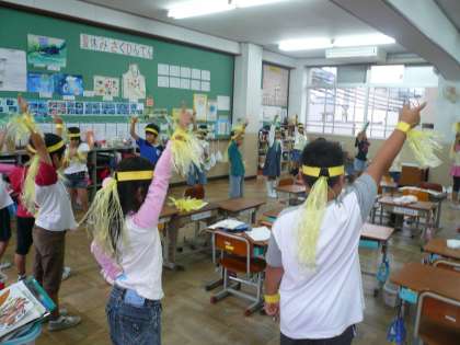 初めて飾りをつけて練習したので,みんなの気分は大盛り上がりで,元気いっぱいの踊りを見せてくれました。本番で,他の学年のお子たちや,保護者・地域の方に見てもらうのが楽しみです。