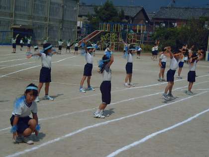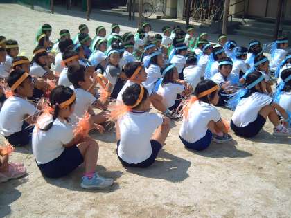 今日の運動会の練習では,先日手作りしたグッズを身に付けてダンスを練習しました。オレンジ・ブルー(1組),黄色・黄緑(2組)が太陽にキラキラ輝いて,気分も盛り上がっているようでした。調子は上々。土曜日の本番までお天気が続きますように・・・。