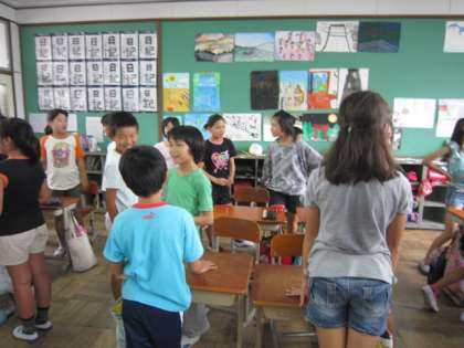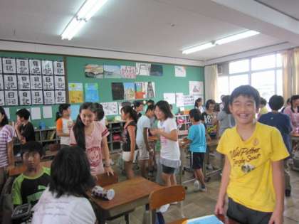 5年生は、今、外国語活動で学習しているところの最後の活動で「6年生のお気に入りのTシャツをつくろう」に取り組んでいます。今日は、昼学習の時間を利用して,5年生が6年生の教室に行き,好きな色、形、番号、動物を英語で尋ねました。そのデータをもとに,一人一人のお気に入りのTシャツをデザインするのです。5年生の質問に、6年生も親切に答えてくれて,とてもよい雰囲気でした。