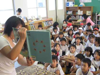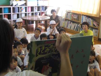 いつも集まってくる1年生と2年生が運動会の練習に取り組んでいるので,体操服での参加です。ちょっと雰囲気が違いました。今日の絵本は,「ききみみずきん」。鳥や動物の声が聞こえる不思議な頭巾を手に入れて,幸せをつかんだ男のお話です。有名な昔話で,子どもたちはしっかり聞いていました。