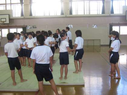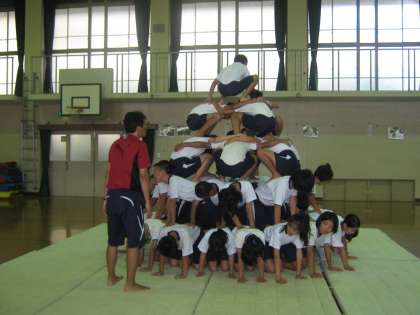 組体操一番の見せ場?!全員で作り上げる塔に挑戦中です。果敢に挑戦しますがうまくいきません。「もっと広がったら?」「ここはもっと近づいたほうがいいなあ。」互いに意見を言いつつ試行錯誤を繰り返します。