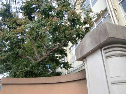 いつの間にか,校門横の百日紅(サルスベリ)の花がほとんど散り落ちました。真夏の炎天下,赤い花を枝いっぱいに咲かせていたあの時の姿とは大きく様変わりしています。