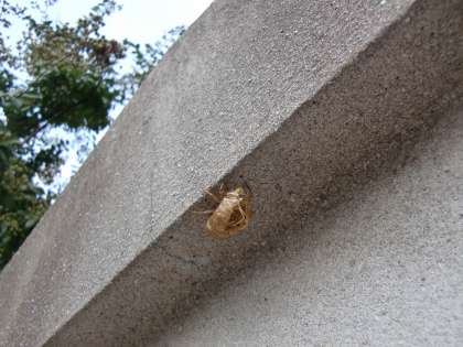 コンクリートの門柱の傘の部分をよーく見ると何かがくっついています。拡大したのが2枚目の写真です。蝉の抜け殻,いつからここにくっついていたのでしょう。気がつきませんでした。まさに「空蝉(ウツセミ)」という呼び方が今朝は心に沁みいるようです。
