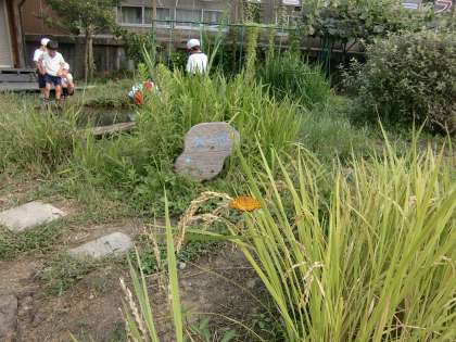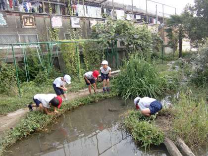 朝休みのビオトープ。すっかりおなじみの1年生のザリガニハンターたち。素手で勝負する本格派。ワイルド感充満。ザリガニもきっと必死。