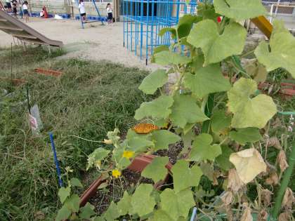 田んぼの稲にツマグロヒョウモン。昨日,観察箱からリリースしたもの? 見回せば,すぐ近くにもう1頭。間違いなく観察箱でかえったツマグロヒョウモンのオス2頭。