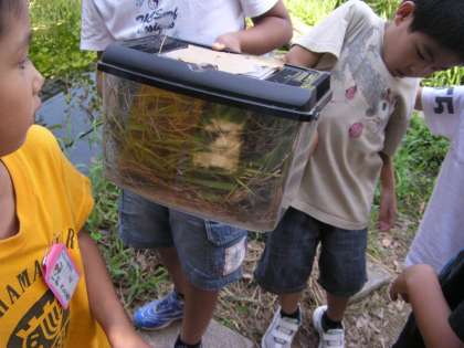 バッタを,飼育ケースにいっぱい集めていました。ビオトープでは,いろいろな生き物を子ども達は,見ています。