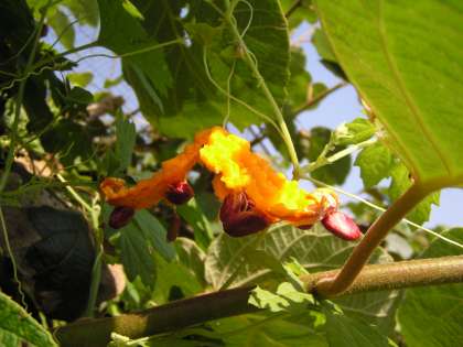 ニガウリが,黄色くなり,赤い種を落とそうとしていました。