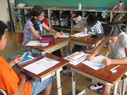 先日,総合的な学習の時間で社会見学に行きました。その時に学んだことを,国語の「町のよさを伝えるパンフレットを作ろう ようこそ,わたしたちの町へ」という単元でパンフレットにまとめる学習をしています。頭を抱えながら悩み,班ごとに何度も推敲を重ね工夫して作る自分たちだけのパンフレット。出来上がりが楽しみです。
