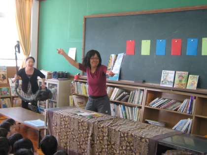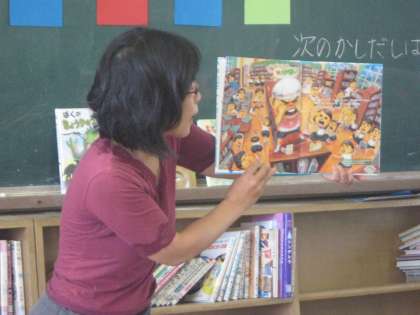 今日のおはなしわくわくは,『おそうじ隊員』という絵本でした。『給食番長』の絵本でおなじみのよしながこうたくさんの作品です。そのよしながさんの作品の時には,なくてはならないメンバーが四錦のおはなしわくわくのボランティアさんにはいるのです。今日は,掃除機の「ブオーン」という音が途中で入り,雰囲気を盛り上げました。
