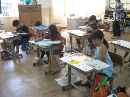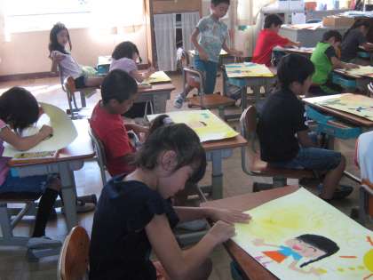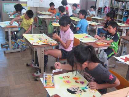2年生の図工で,「おはなしの絵」に取り組んでいます。パスと絵の具の組み合わせで,ステキな絵が出来上がっています。