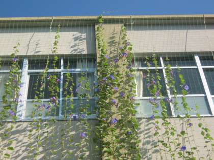 緑のカーテンがまだまだ元気です。今年は暑さが厳しいので,朝顔もまだ夏かと思っているのでしょうか。気持ちの良い日陰を作ってくれている朝顔に感謝です。
