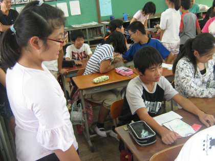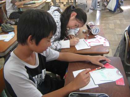 9月18日に,昼学習で5年生と外国語活動の交流をした記事を掲載しました。5年生が6年生に好きな色や形の質問をして,それをもとにTシャツ型の紙にデザインし,6年生にプレゼントするという5年生の活動です。