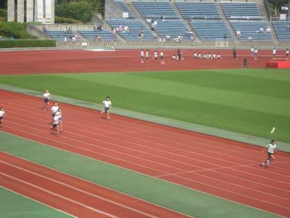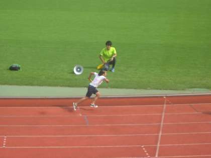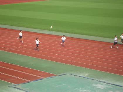 最後の競技は,四錦からの参加者全員が出場する100メートル×4リレーです。走る順番待ちの人や走った後の人が「がんばれーっ!」と声を張り上げて仲間を応援しました。