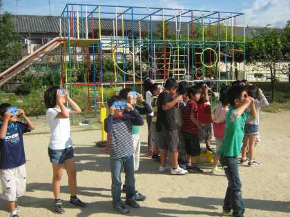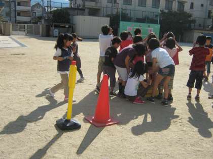 昨日かげふみ遊びをして,みんなのかげは,同じ方向にできていることに気付きました。それでは,そのかげは時間がたつとどうなるでしょうか・・・?さっそく観察です。