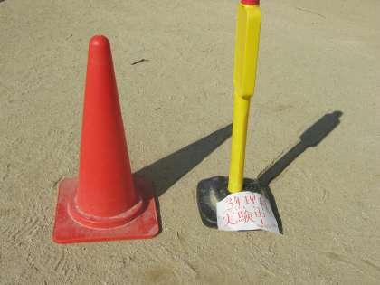 9時。ポールのかげを地面にしるしをつけておきました。太陽がどこにあるかも記録しておきます。