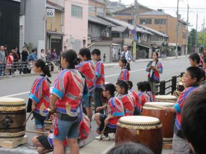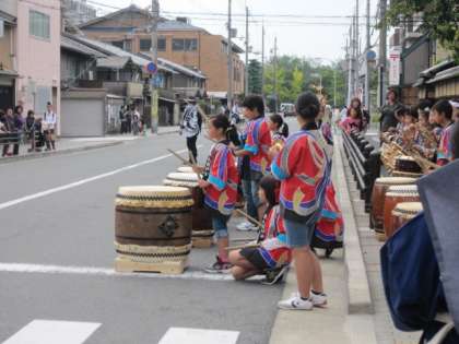 今年は、3年生から6年までの33人が参加しました。今年は部員数が多く、小さい太鼓をたたいたり、鉦をたたいたりと指導者の今宮太鼓の方に工夫していただいているのがよくわかります。沿道のお客さんの前で少し緊張気味でしたが、よく頑張りました。