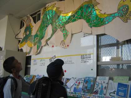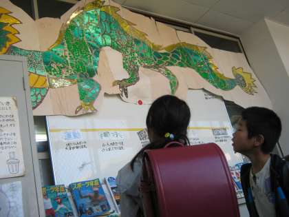 企画委員会が発表してくれた龍が,職員室前の廊下に改めて掲示されています。子どもたちは,朝,その龍を見つけて,「あそこが○年○組の所だ」「僕はあそこに貼った」と話し合っていました。長い期間続けていたので,愛着がわいていたのでしょう。