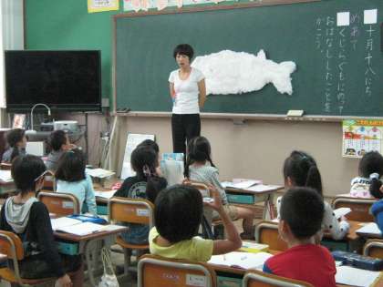 みんなが乗れるぐらい大きな“くじらぐも”が教室にも登場です。
