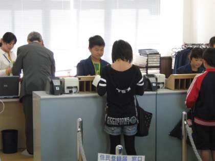 全員が住民登録に来る区役所。お客様の対応に追われました。また,住民税を納めてもらったり,未納者に声をかけに行ったり,「歩く街・京都」の標語募集を行ったりたくさんの仕事をこなしていきました。