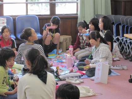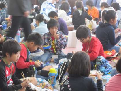 お昼休憩でホッと一息です。各ブースごとに集まってお弁当を食べ,ブースの仲間との仲も深めました。仕事を通して新しい友達もたくさんできたようです。