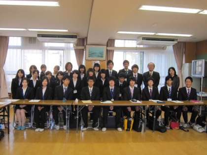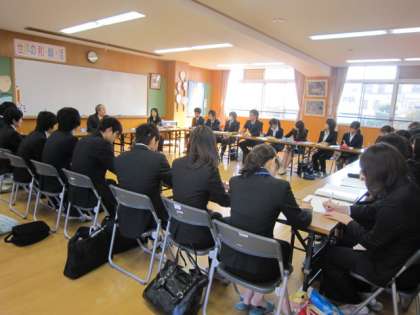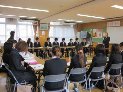 皆さん朝からパリッとスーツ姿で,少し緊張気味に学校に入ってきました。担当の泉教授とともに,まず2階のふれあいサロンに入りました。
