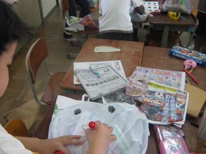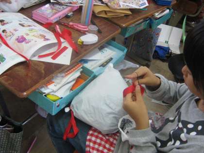 図工で「ふくろちゃん」という学習をしました。袋をふくらませてできた形をさらに工夫して友だちにしました。名前もつけました。