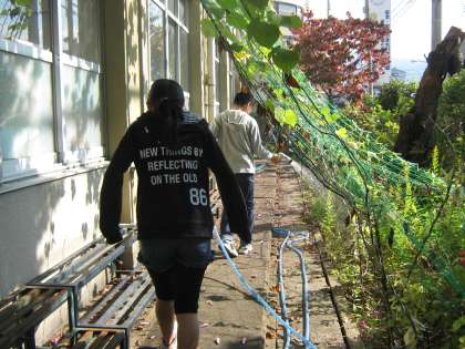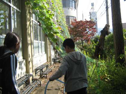 環境委員会の子どもが,グリーンカーテンのアサガオに水やりをしているところに出会いました。子どもたちが責任を持って水やりをすることで,アサガオはぐんぐん伸びているのですね。