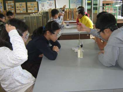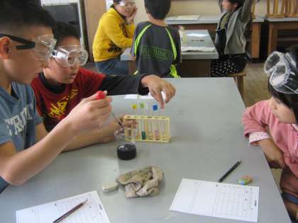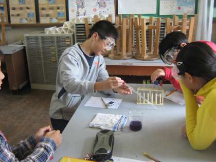 今回はここで色と水溶液を発表しました。どこの班も透明な水溶液が,本当にきれいな色に変化し,「きれい」「すごい」と声があがっていました。