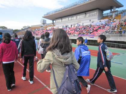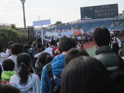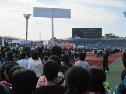 開会式に先立って入場行進がありました。これには小学生も参加します。区の体振ごとに行進します。左京区は一番最後でした。トラックを一周して,バックスタンドに入りました。子どもたちにとっては、これもよい経験ですね。