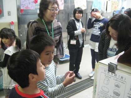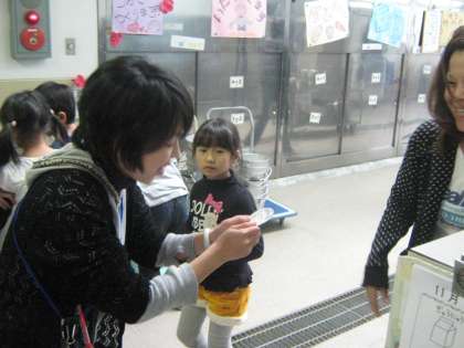 給食調理員さんも子どもたちと触れ合えてうれしそうです。前にも書いたと思いますが,「ペロリン」のデザインは給食調理員さんのオリジナルです。