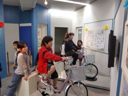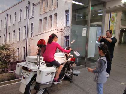 見学の最後に体験コーナーに寄りました。白バイにまたがって,ちょっと警察官の気分を味わっている人もいました。