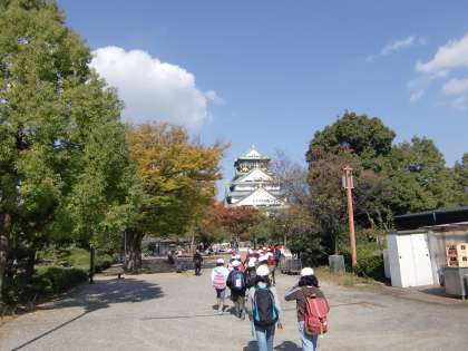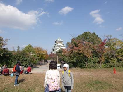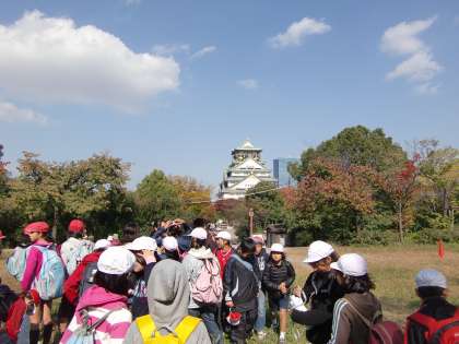 天守閣の下の草っぱらでお弁当を食べました。京都とちがって,ここの上空は飛行機がよく通ります。ここはお弁当にはいい場所なんですが,残念ながらトイレが近くにありません。