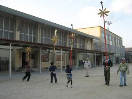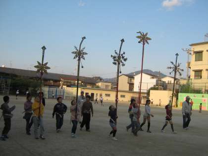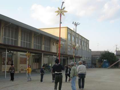 剣鉾を実習生が体験しました。子どもたちがいい音を出しながらしっかり歩いているのに,鈴の音があまり鳴らないので苦労していました。実際にやってみるとその大変さがよくわかりますね。