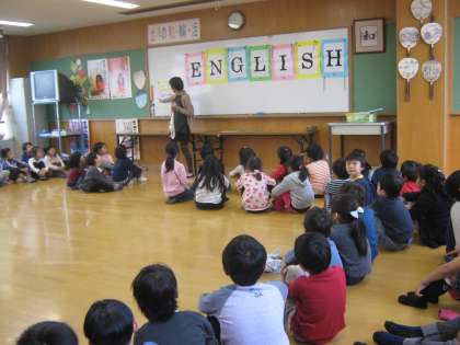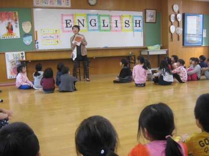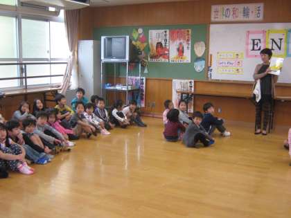 学校探検や遠足で一緒に活動した「なかよしグループ」で久しぶりに活動しました。まずは,「Hello Song」で始まりです。