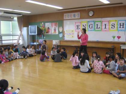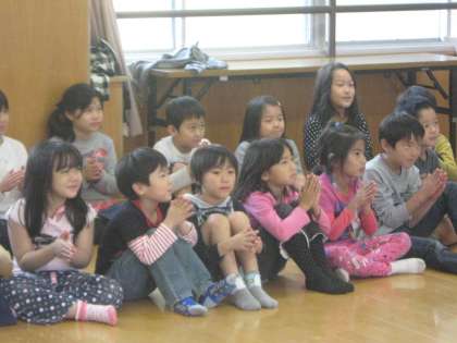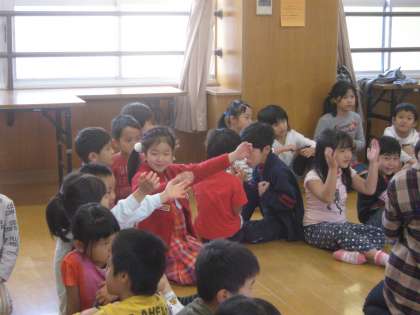 1から7までの数字を英語で言っていく歌です。いつもはジャンケン列車で使う曲です。今日は,決めた数字を言わずに代わりに拍手をしました。拍手する数字が増えるごとに難しさも増していきました。