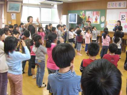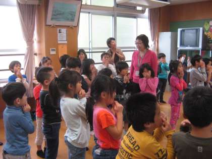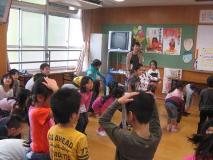 頭・肩・ひざ・つま先や顔の部分を音楽に合わせてタッチしていきます。簡単なようですが,だんだんスピードがアップしていき結構な運動量です。1曲終わるときには体がホカホカでした。でも楽しかったのでアンコールでもう1回しました。