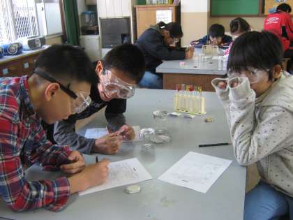 こどもの視線は試験管とビーカーにに釘づけです!45分間という長時間の観察でしたが,集中力をきらさず,楽しく観察することができました!子どものワークシートは観察メモがびっしり。次回のまとめが楽しみです。