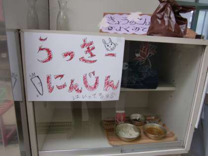 そこで,前回のラッキーニンジンの取組の後,そのことを給食調理員の方々に話しました。「残った方のニンジンもラッキーニンジンでしょ。それも入れようよ。」