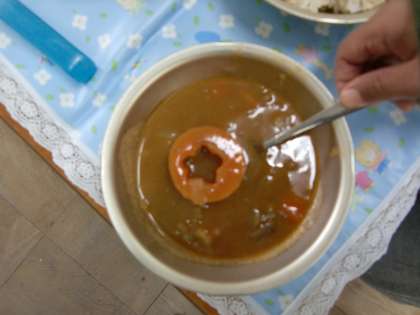 今日の給食はビーフシチュー。各学級の食缶の中にラッキーニンジンが混ぜてあります。そこそこの厚みをもたせて輪切りにしたニンジンを花型にくりぬいて作ったものです。自分の食器に入っていれば,「ラッキー!!」というわけです。(ちなみに星型やハート型もあります)