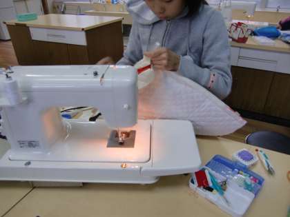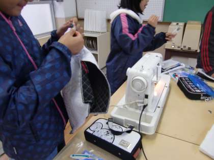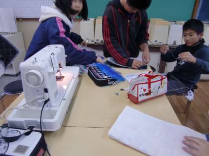 家庭科室で5年生が電動ミシンを使って,ナップザックを作っています。