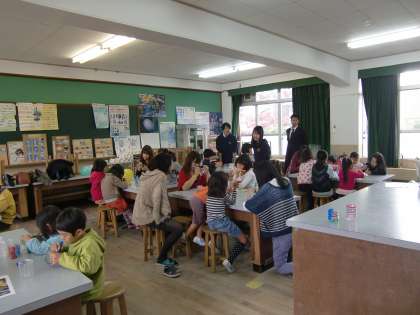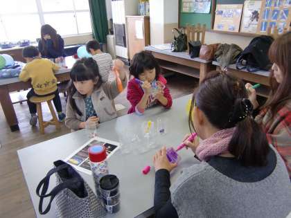 風船バレーの後,子どもたちは理科室でキャンドルポットを作りました。ペットボトルの上半分を切り取ったものにマーカーペンで色を塗り(絵を描き)キャンドルポットに仕上げます。