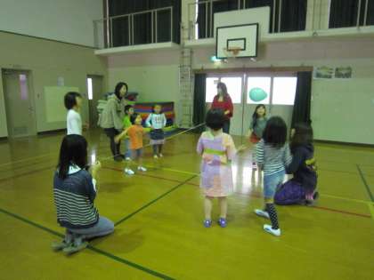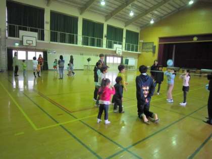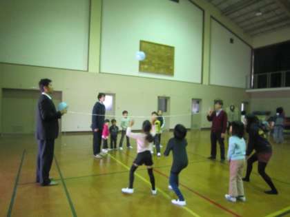 今日のサタデースクールは,当初の予定を変更して体育館で風船バレーをしました。風船の中にスーパーボールを入れてあるので,普通の風船のようには飛びません。変わった飛び方をするからおもしろいです。全部で4班に分かれて,同志社大学の学生さんと一緒に楽しみました。